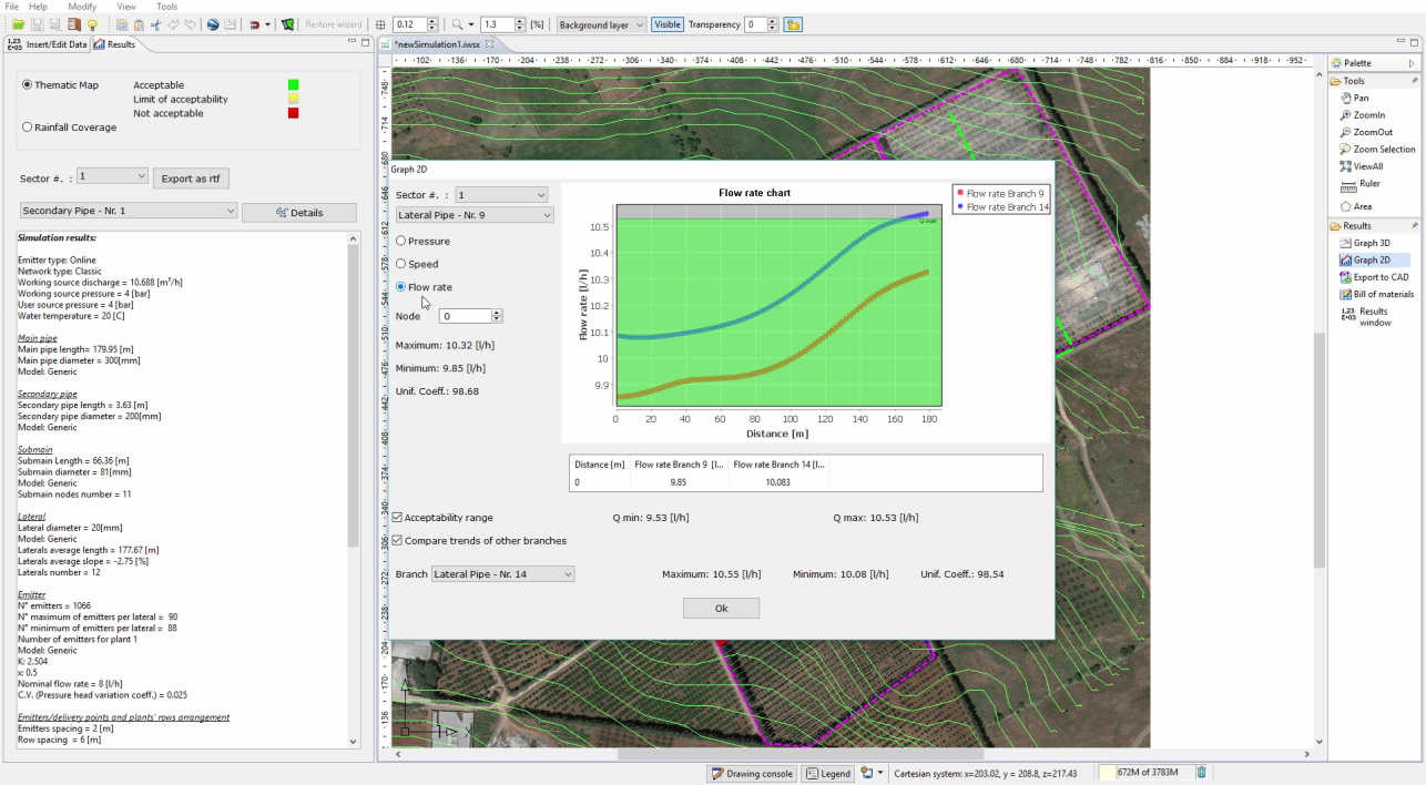 Once the boundaries of the land and the desired route of the main pipe have been traced, IrriPro will automatically design the entire irrigation network, also choosing the dimensions of the pipes for you