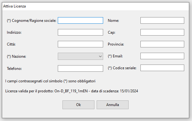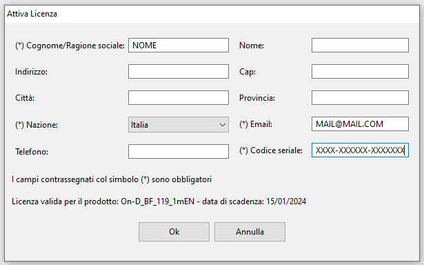 All’interno della finestra compilare tutti i dati obbligatori contrassegnati con (*). Copiare qui il codice seriale ricevuto via mail e quindi su OK