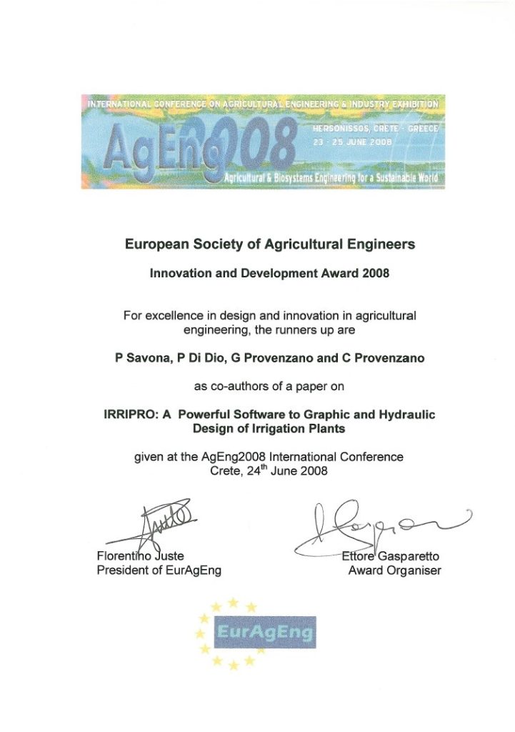 The recognition received by the Organizing Committee (in a shortlist of the three best memories) for “excellence in the design and innovation of agricultural engineering” is related to the work entitled “IRRIPRO: A powerful software to graphic and hydraulic design of irrigation plants”. The work received recognition of merit from the Organizing Committee (in a shortlist of three best memories) for “excellence in design and innovation in agricultural engineering”.