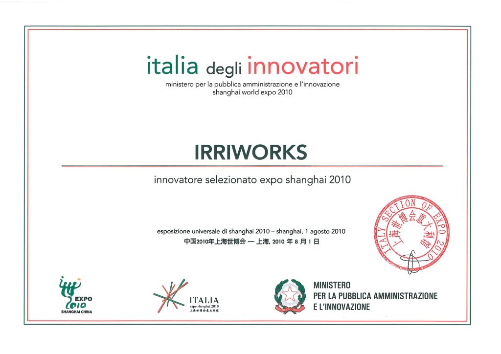 Irriworks was selected by the Technical Committee (appointed by the Minister Renato Brunetta and the General Government Commissioner for the Shanghai Expo Beniamino Quintieri) which evaluated a total of 454 innovations, of which 265 met the expected requirements. Irriworks received this recognition for being selected among the companies participating in the Shanghai Expo.