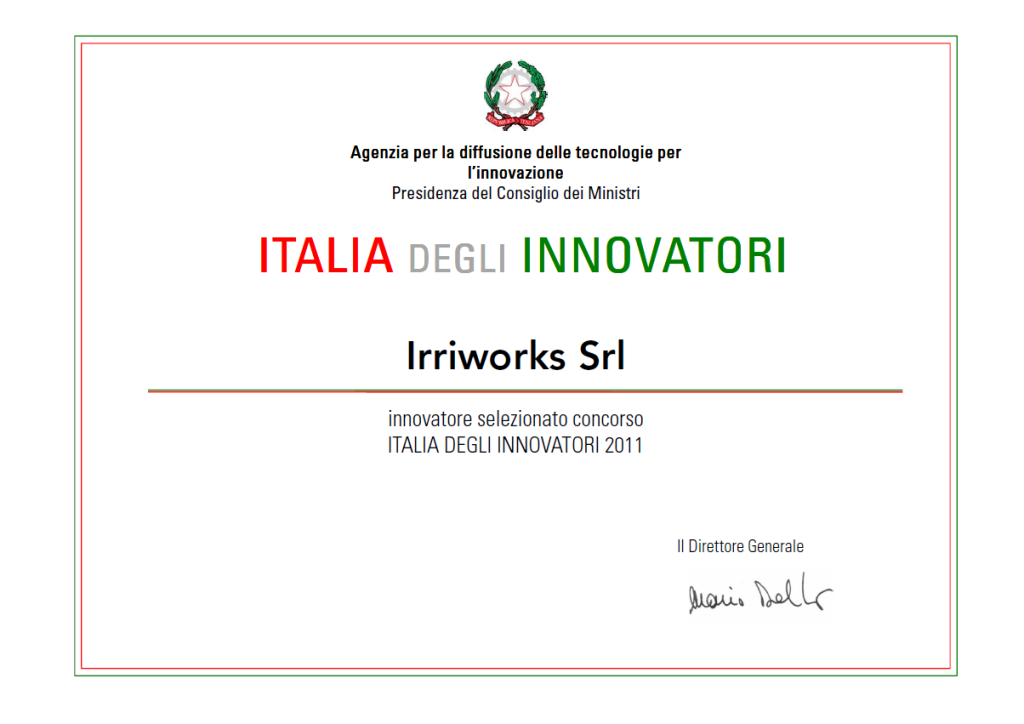 Riconoscimento ricevuto da Irriworks come innovatore selezionato al concorso Italia degli Innovatori 2011.