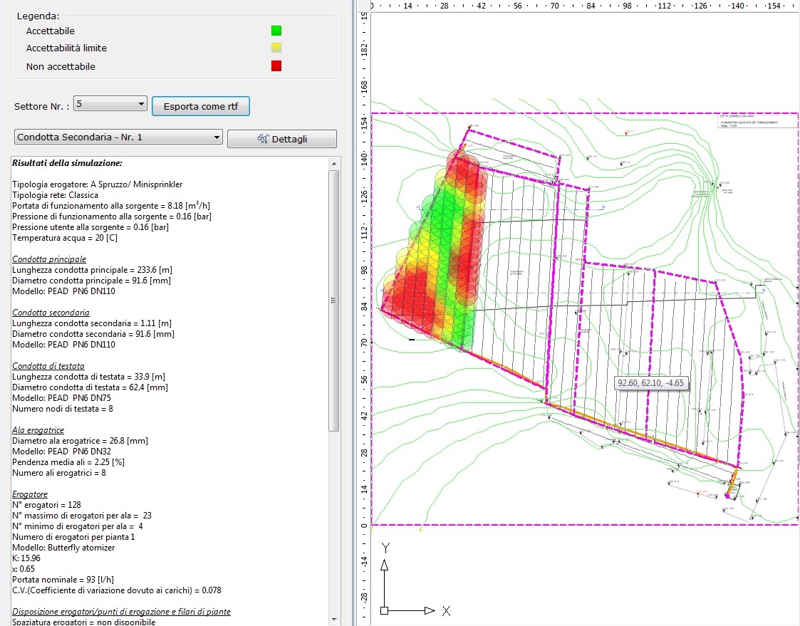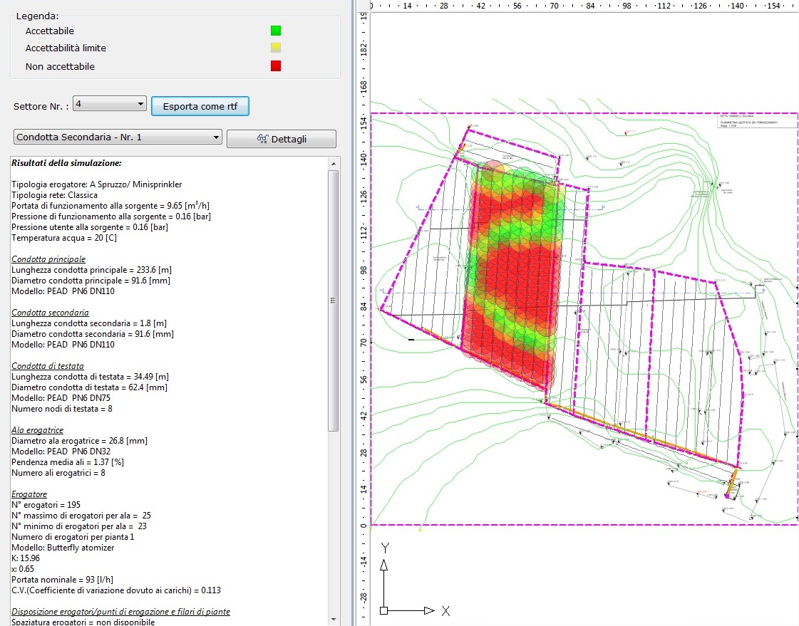 Mango plants have a planting space of 3 x 4 metres. A request per plant of 80 litres/week was considered, supplied in 2 shifts of 40 litres. Below are some starting documents and the results of the hydraulic simulation.