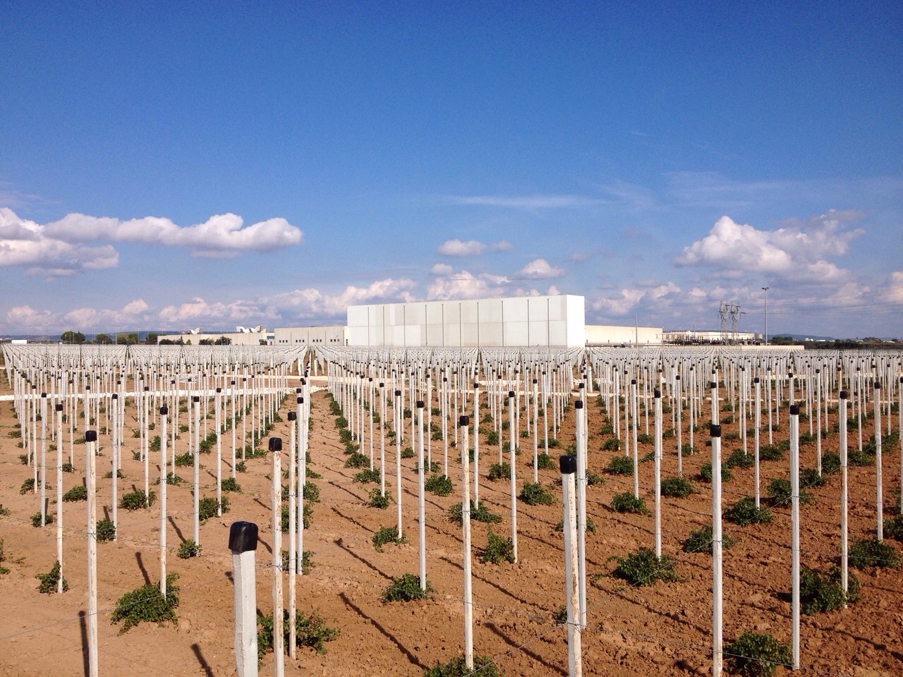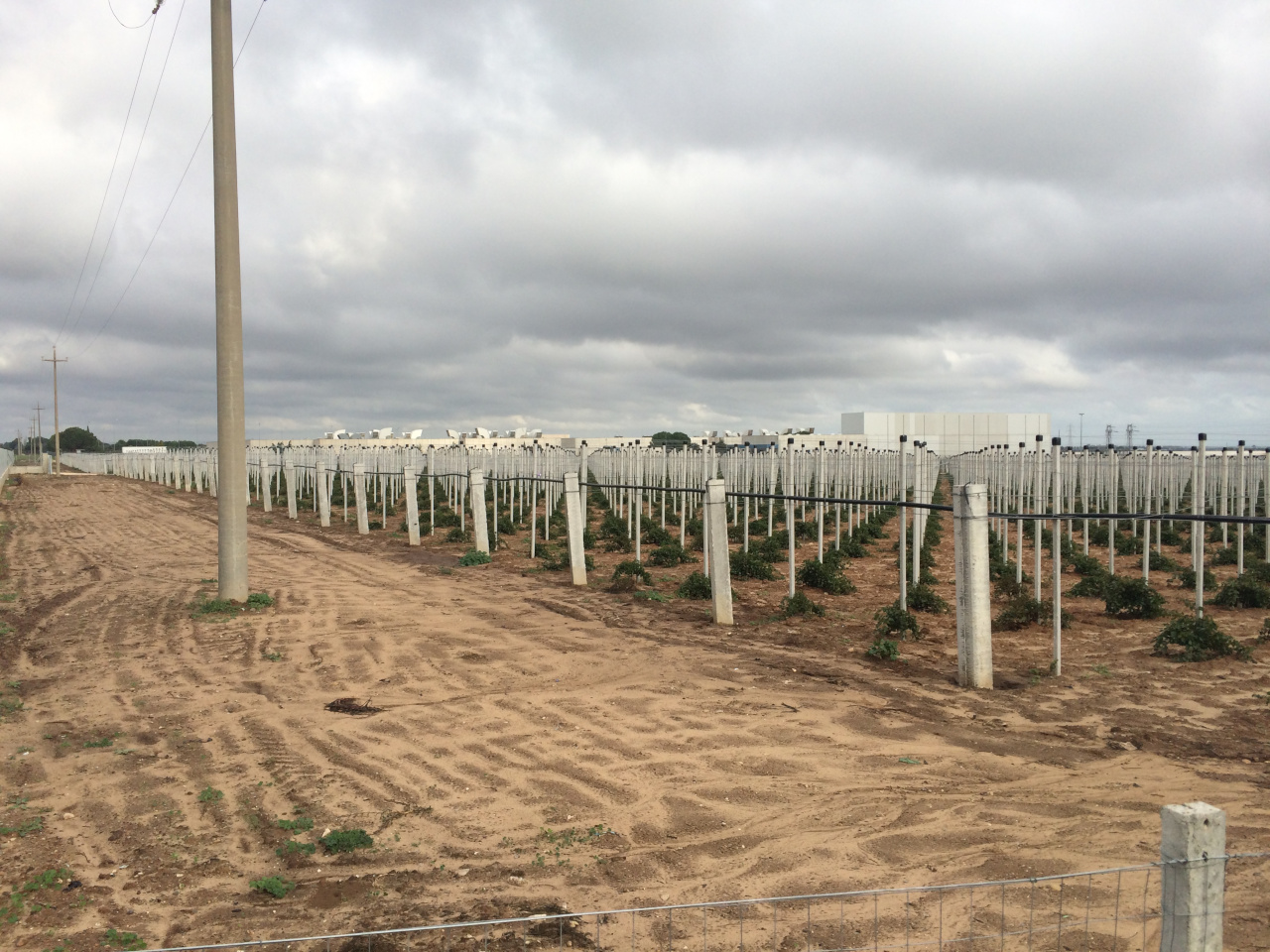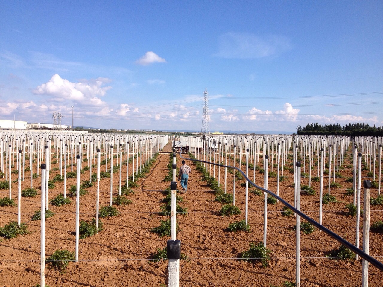 On land with gentle slopes of 1.5% and a surface area of more than 30 hectares, a drip system was designed and built with 150,000 devices of 2 litres/hour and spacing of 2.5 metres. Driplines are placed every 2.5 meters. The plant is managed in 6 shifts with 4 sectors powered for each shift which require a flow rate of 36 cubic meters/hour at a pressure of 2.5 bar.
