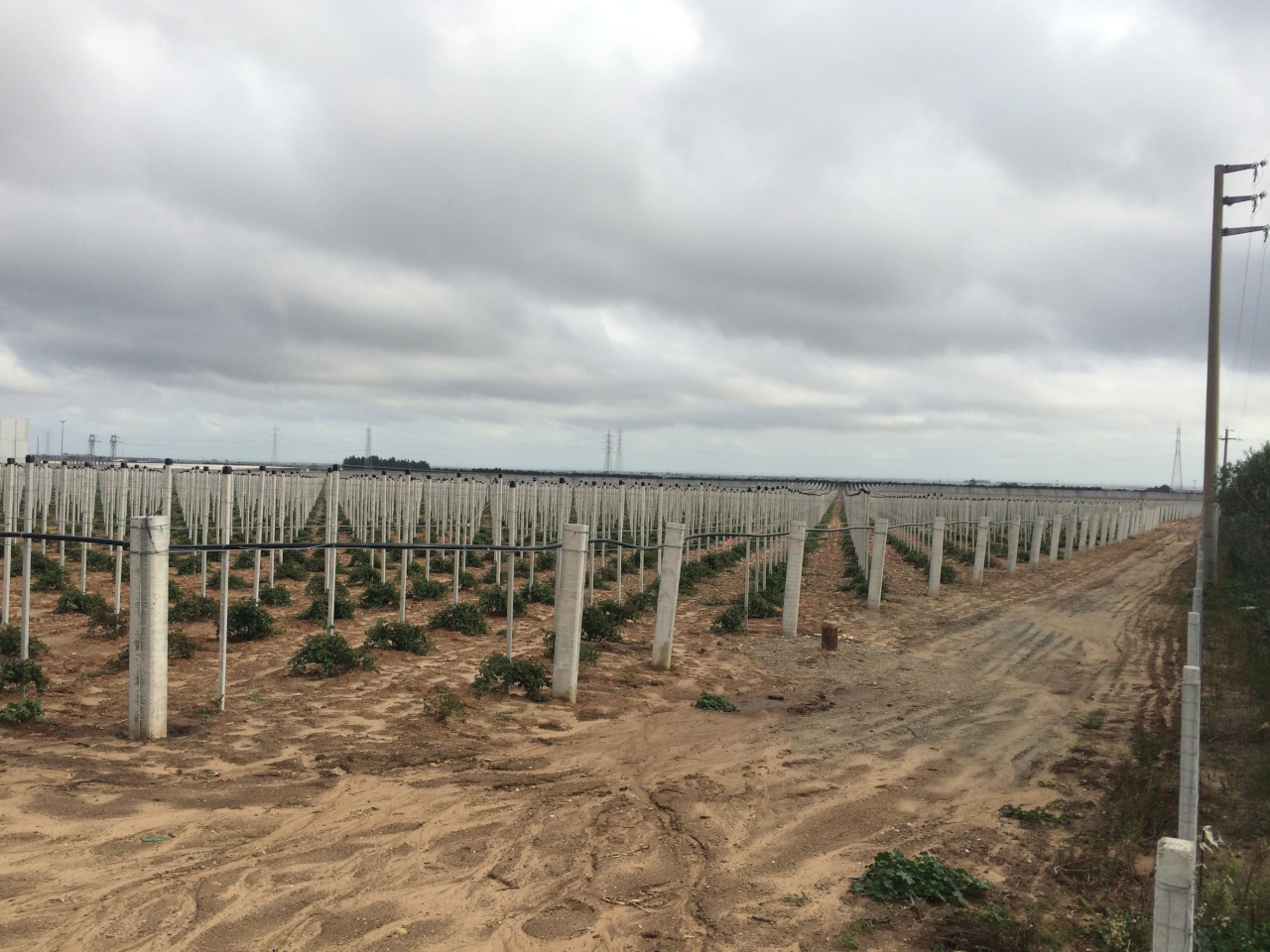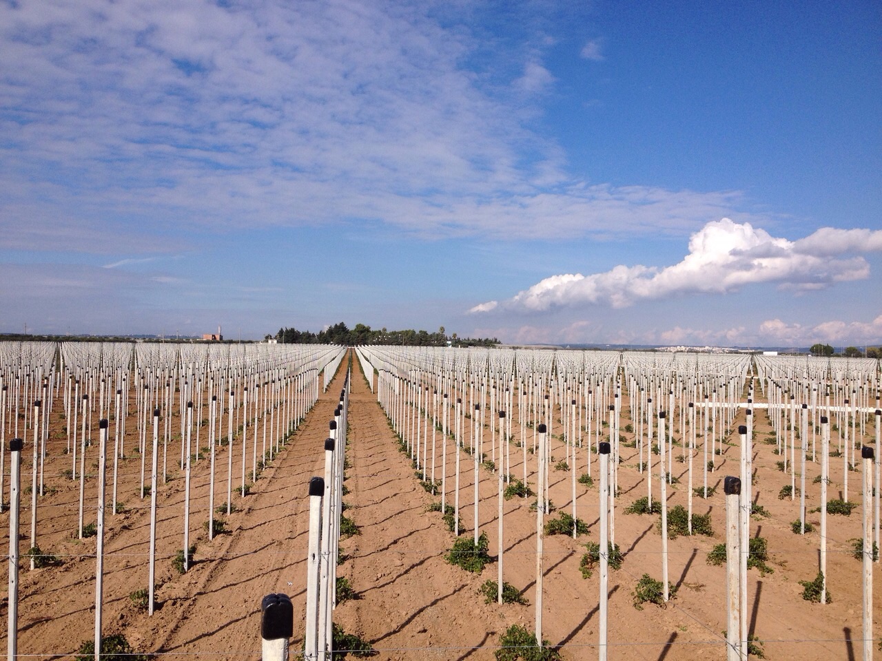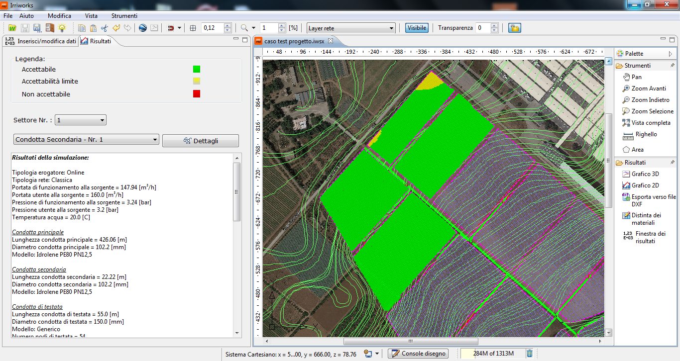 On land with gentle slopes of 1.5% and a surface area of more than 30 hectares, a drip system was designed and built with 150,000 devices of 2 litres/hour and spacing of 2.5 metres. Driplines are placed every 2.5 meters. The plant is managed in 6 shifts with 4 sectors powered for each shift which require a flow rate of 36 cubic meters/hour at a pressure of 2.5 bar.