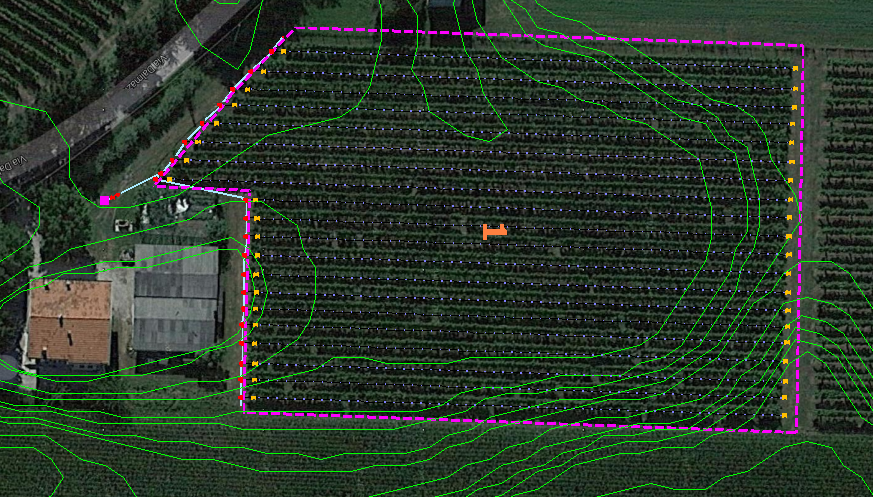 The system near Conegliano (Veneto) extends over a small area and is made up of laterals 3.5 meters apart and self-compensating drip dispensers of 4 L/h with a pitch of 1.4 metres. The source has a pressure of 2 Bar. The geometric dimensions of the area and the short distance from the power supply facilitate uniform conditions in the system.
